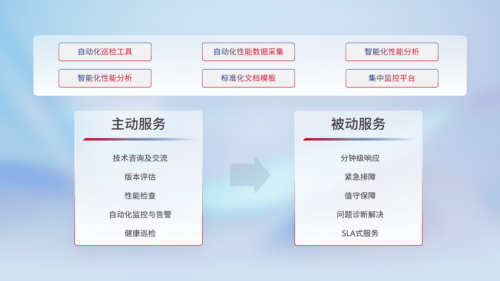智能化工具和标准化文档,,,,保障服务质量,,,提供主动服务(包含技术咨询、、、版本评估、、、性能检查、、、、自动化监控与告警、、、、健康巡检)和被动服务包含(分钟级响应、、、紧急排障、、、值守保障、、、、问题诊断解决、、SLA服务)。。。